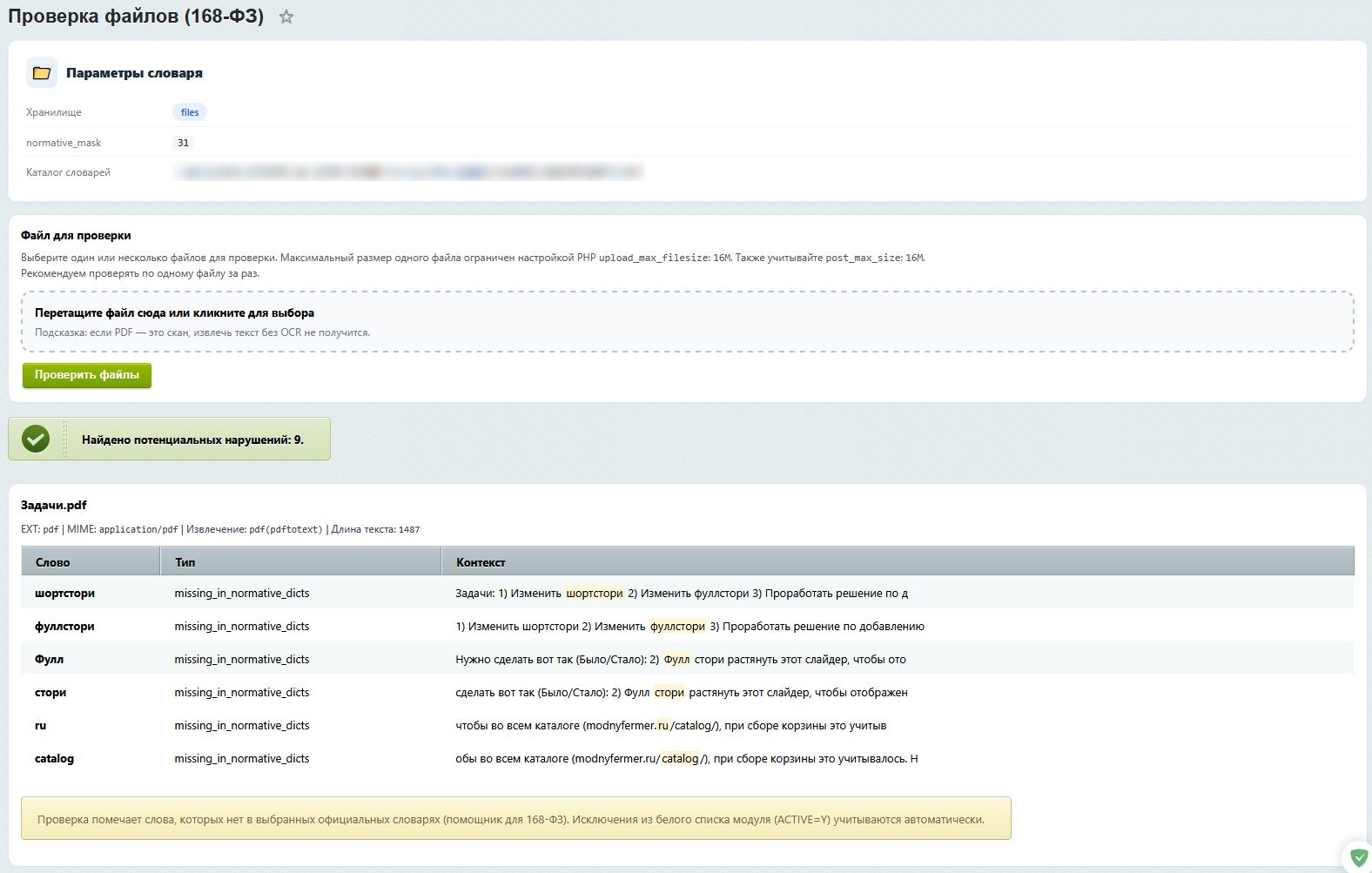 1. Требуется ли доступ к консоли сервера для работы? Нет, модуль полностью работает в рамках PHP-окружения Bitrix. Импорт словаров и сканирование доступны через веб-интерфейс. Подключение phpMorphy опционально для улучшения качества морфологии. 2. Как модуль определяет, что слово является нарушением? Слово считается потенциальным нарушением, если оно не найдено в выбранных нормативных словарях (с учетом лемматизации) и не внесено в белый список. Тип нарушения маркируется как missing_in_normative_dicts.