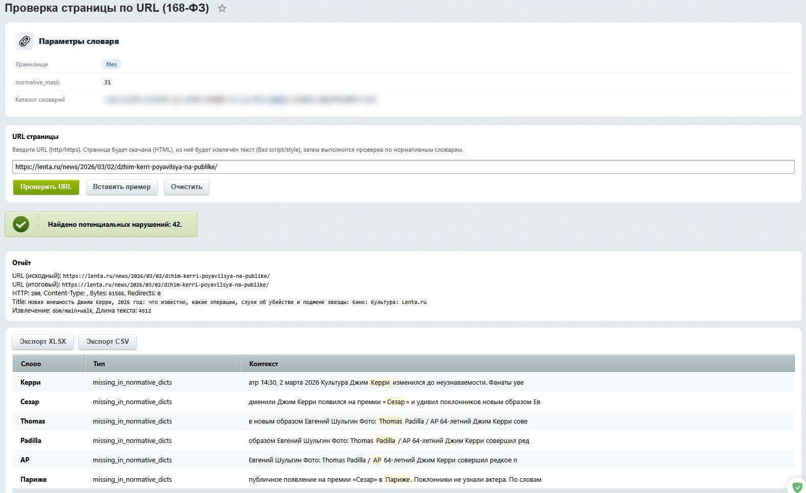 Добавлен раздел «Проверка страницы по URL» (недоступен в демо-режиме). Страница будет скачана (HTML), из неё будет извлечён текст (без тегов script/style), затем выполнится проверка по нормативным словарям. Предусмотрен экспорт результатов в XLSX/CSV.